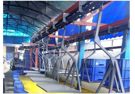 This overhead conveyor comprises of fully Biplaner chain having two load bearing wheels, and two guide wheels, which move smoothly in conveyor track. Motive power is provided by a sprocket type drive wheel is directly connected to the worm reduction unit which is driven T.E.F.C. motor. Tension unit is provided for the required take-up and tension of the system